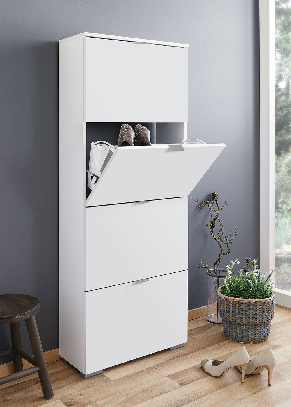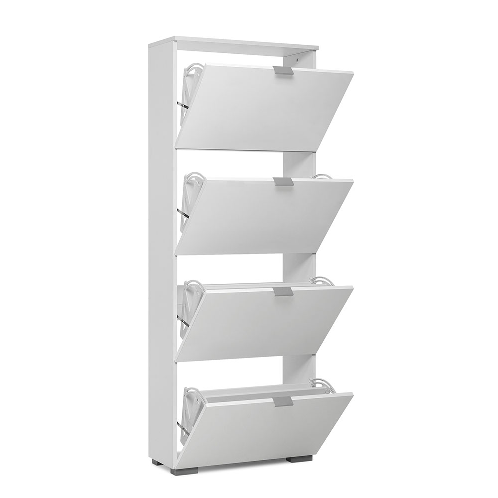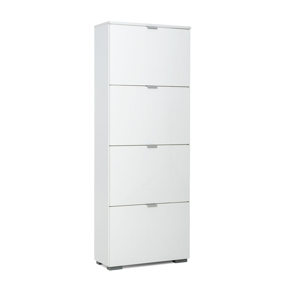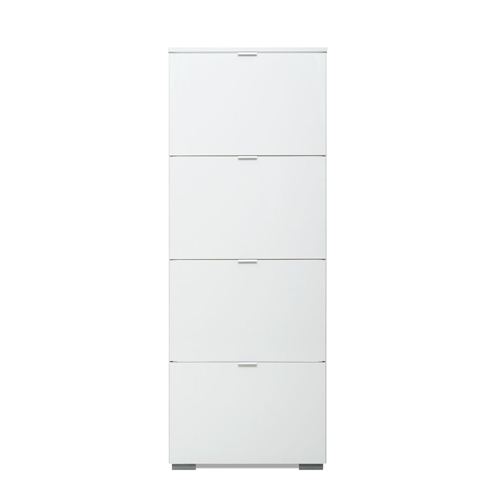 Botník s 4 výklopnými zásuvkami Wien je celý bílý, avšak čela zásuvek jsou lesklá.