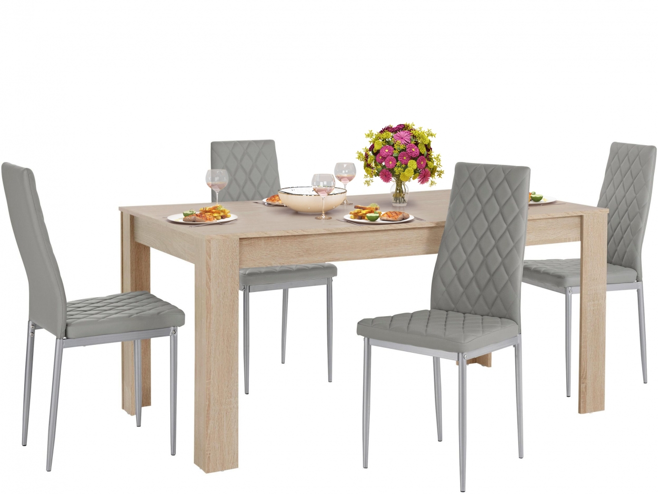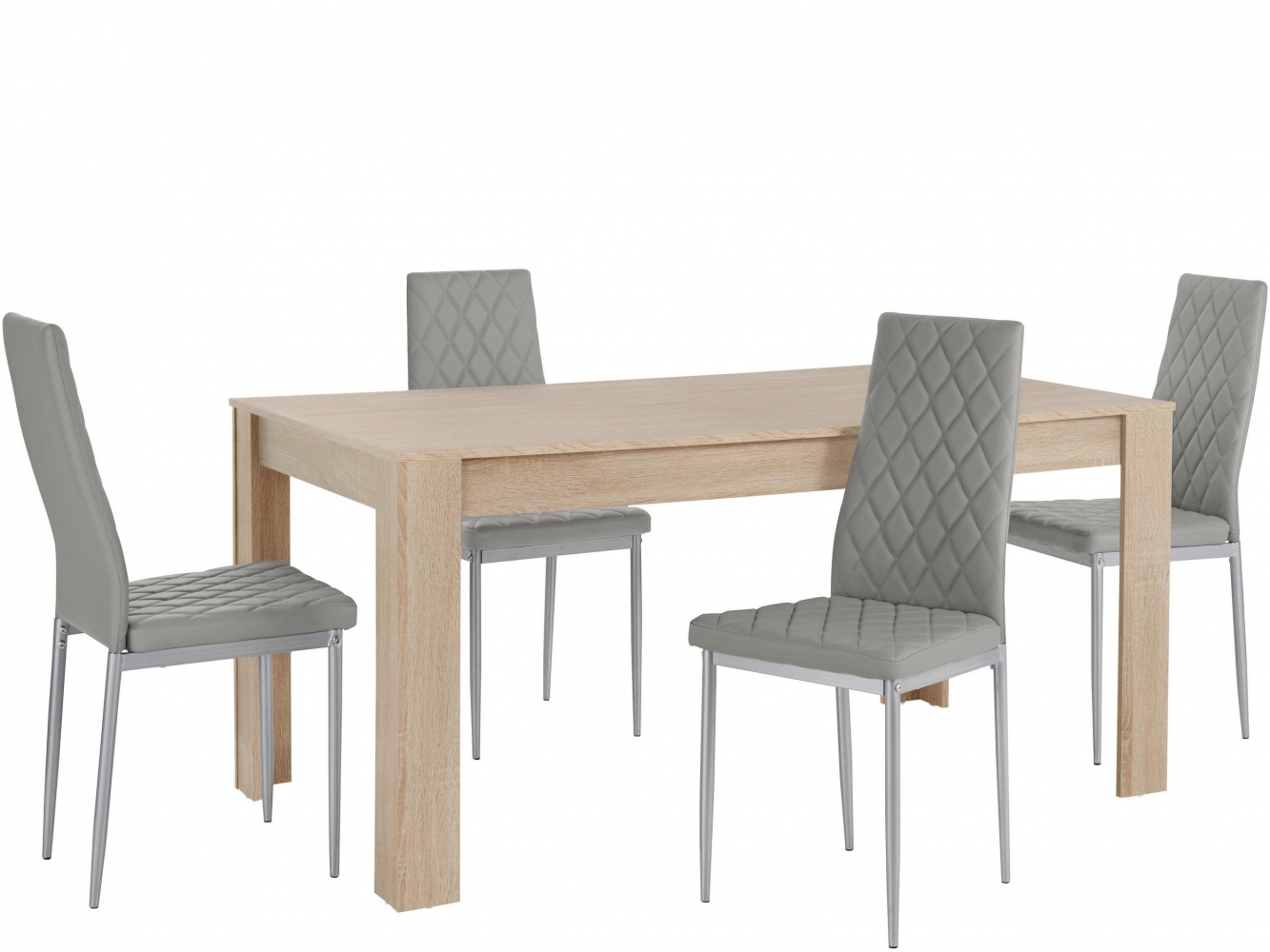 Jídelní set Bero je moderní jídelní nábytek, který se hodí do všech interiérů. 4 jídelní židle s měkkým čalouněným sedákem syntetickou kůží doplňuje jídelní stůl z MDF v dekoru dubu.